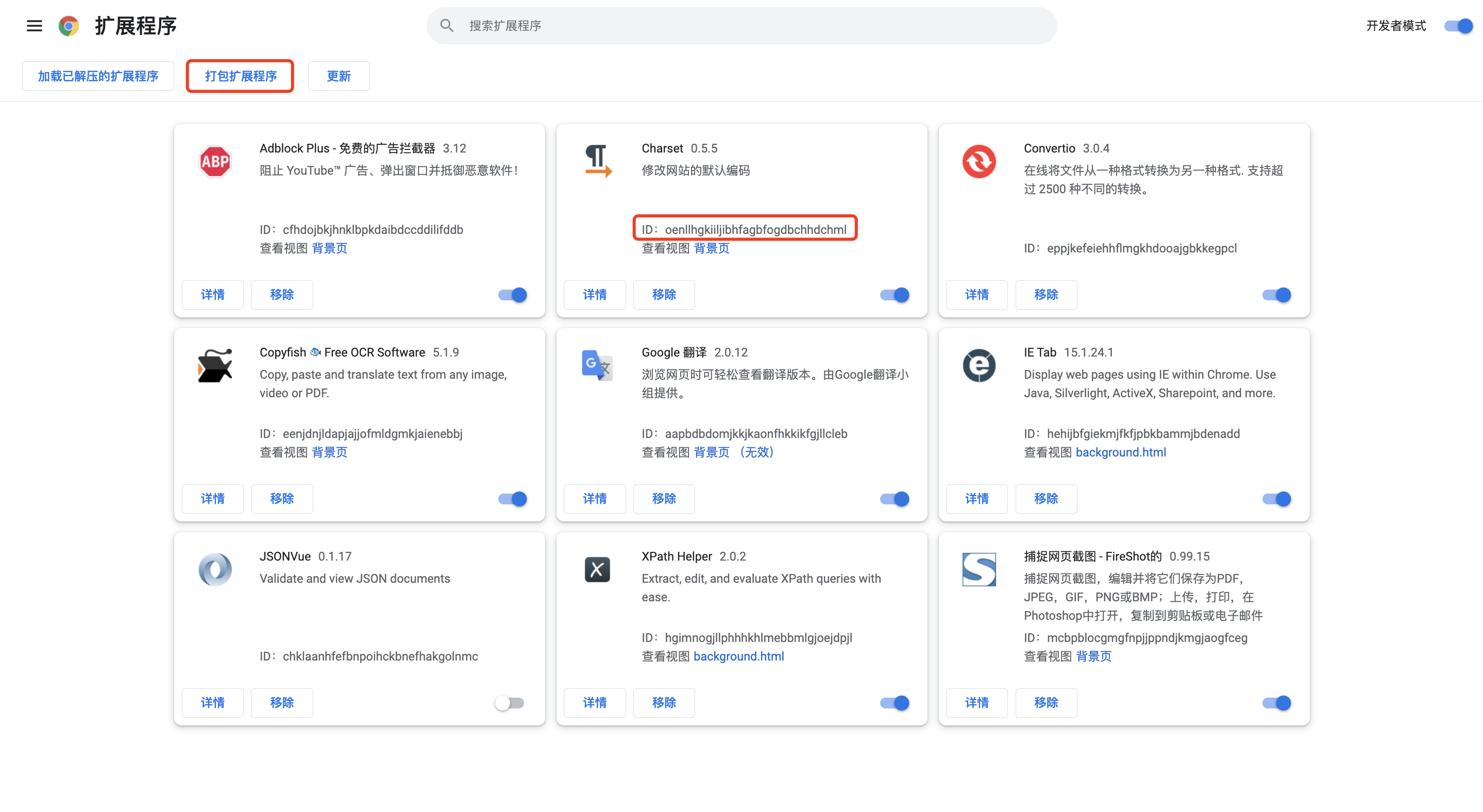 在插件面板中,可以看到每个插件的ID,以及一个叫做打包安装程序的按钮。