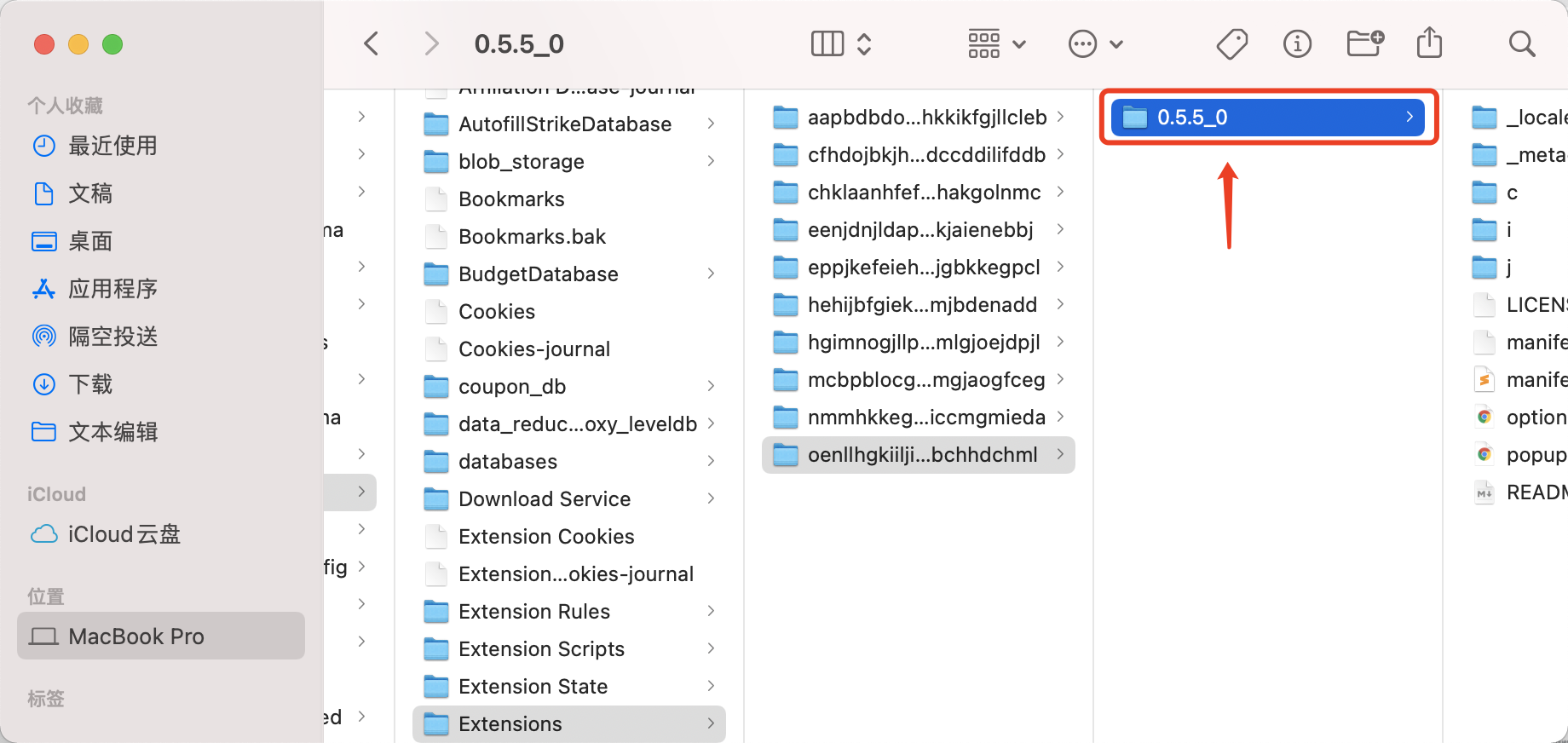 在这个目录中,就是所有已经安装的扩展程序的目录了,目录下级的各文件夹,就是刚才看到的插件ID。