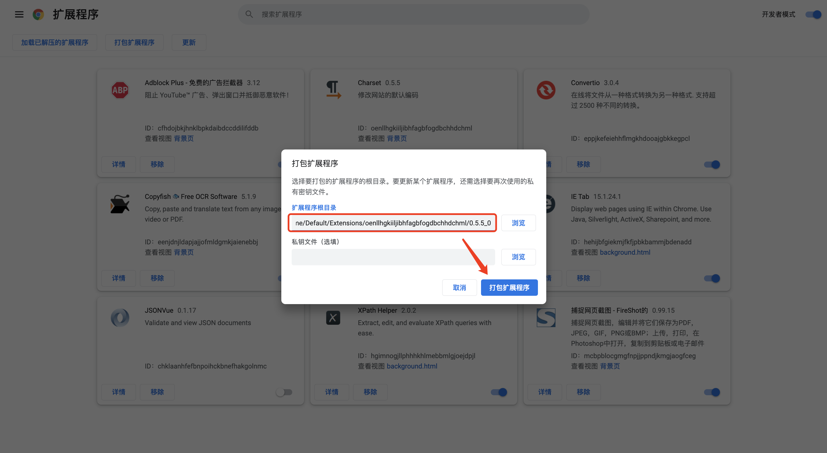回到浏览器,点击打包扩展程序,并将复制的绝对路径粘贴进来,然后点击蓝色的打包扩展程序